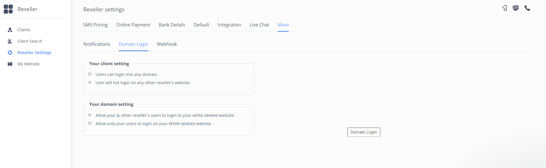 1. The page where you will get all the details to Enable/Disable the login functionality under Reseller Settings.